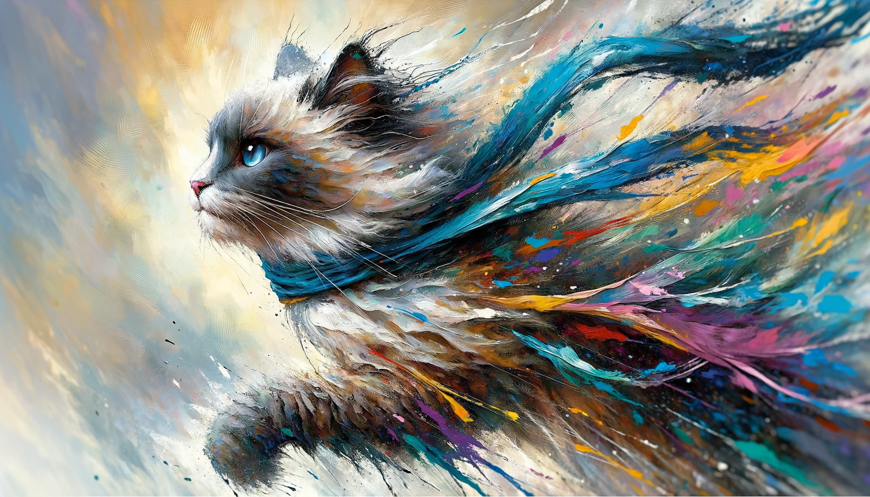 Song Summary: "Forty Six & 2" by Tool. What the song means to me... The song "Forty Six & 2" by Tool delves into the concepts of psychological transformation and personal growth. Drawing inspiration from Jungian psychology, it explores the idea of confronting and integrating the 'shadow self' – the unacknowledged or less desirable aspects of one's personality. The lyrics reflect a journey of introspection, self-confrontation, and eventual growth, suggesting a transcendental evolution to a higher state of consciousness. Artwork Summary The series of artwork captures the essence of this transformative journey, portraying Sassy, a Ragdoll cat, as she navigates the complex path of self-discovery and growth. Each image visually interprets key moments of confrontation, struggle, realization, and enlightenment as outlined in the song. The artwork style – a blend of vibrant, expressive brushstrokes and hints of impressionism – vividly conveys the texture and depth of Sassy's emotional and psychological landscape. From moments of intense self-confrontation to the serene acceptance of her full self, the images chronicle a profound journey of transformation, mirroring the introspective and evolutionary themes of "Forty Six & 2".